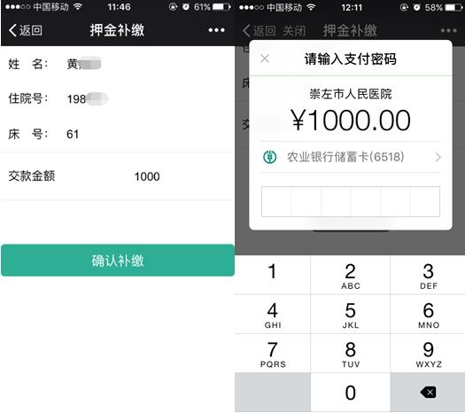 就诊服务>>住院押金补缴>>选择就诊人>>押金补缴>>输入交款金额>>确认补缴>>微信支付